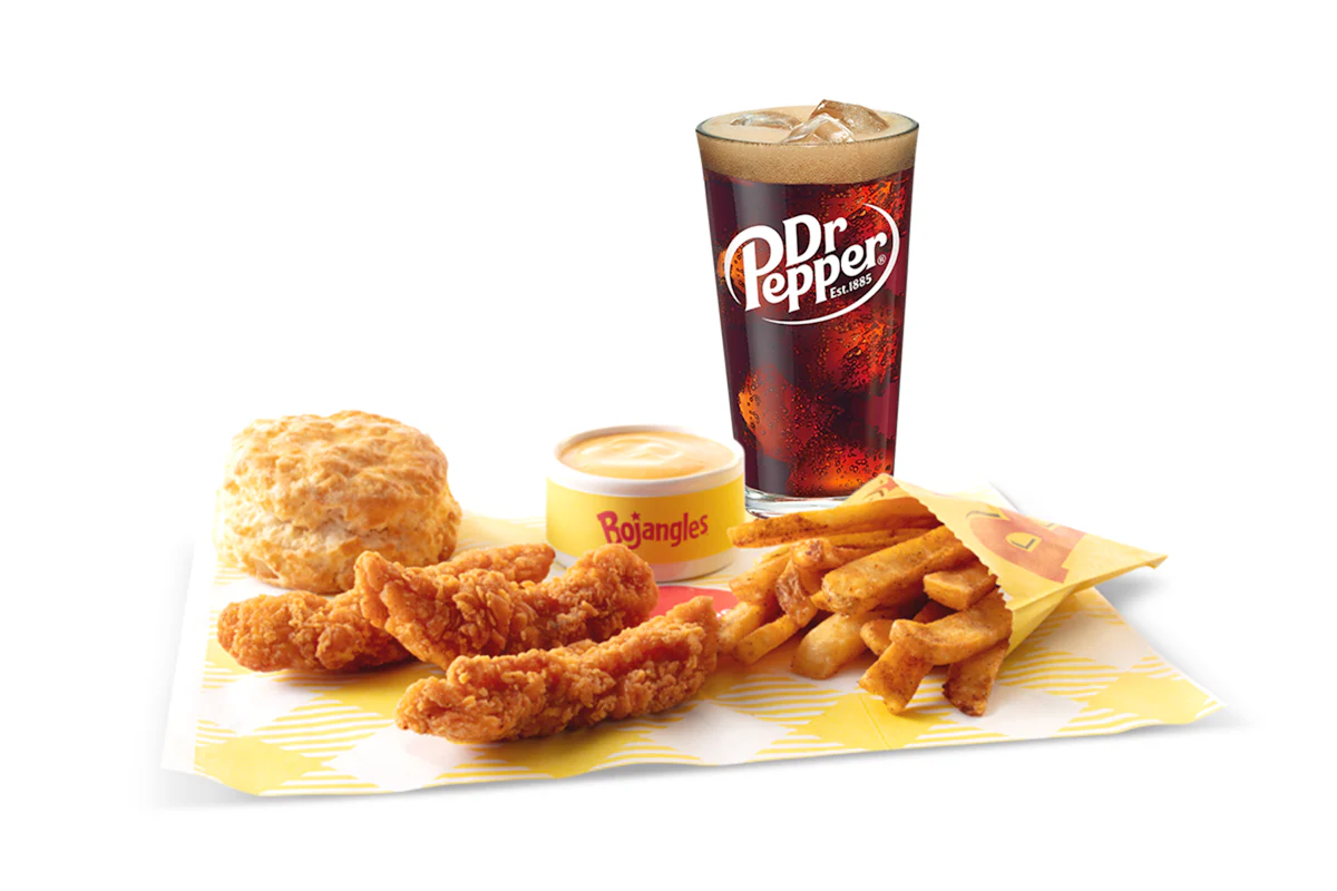 3 whole-breast hand-breaded chicken tenderloins made with bold flavor and served with a made-from-scratch biscuit, a fixin’, and a Dr Pepper.